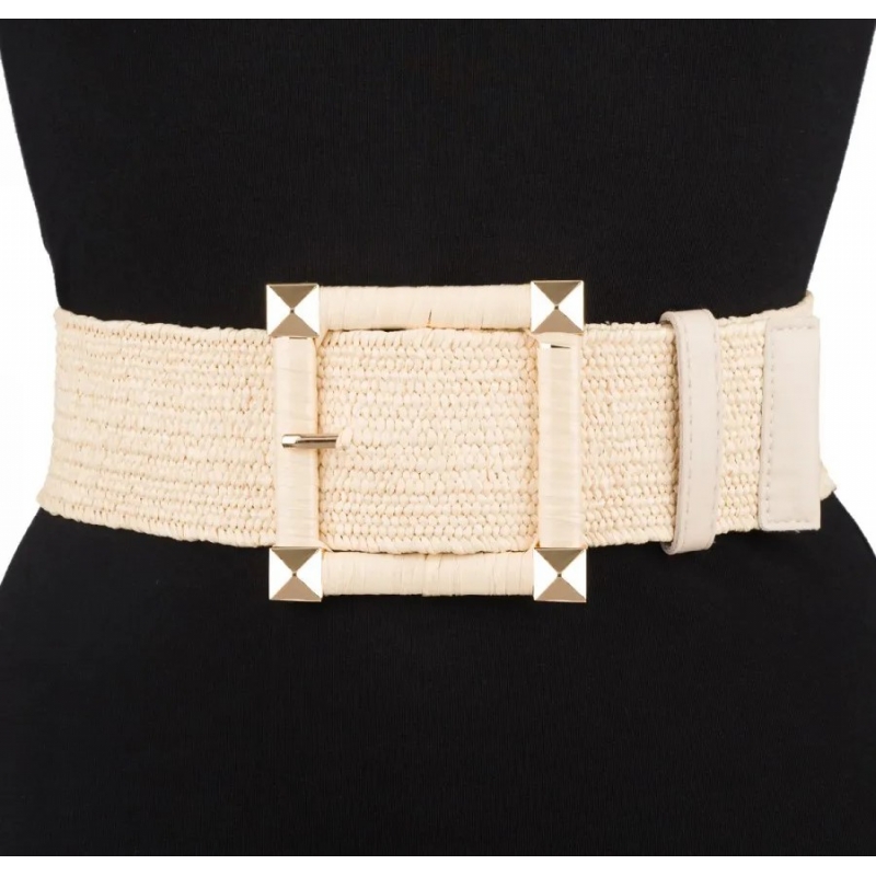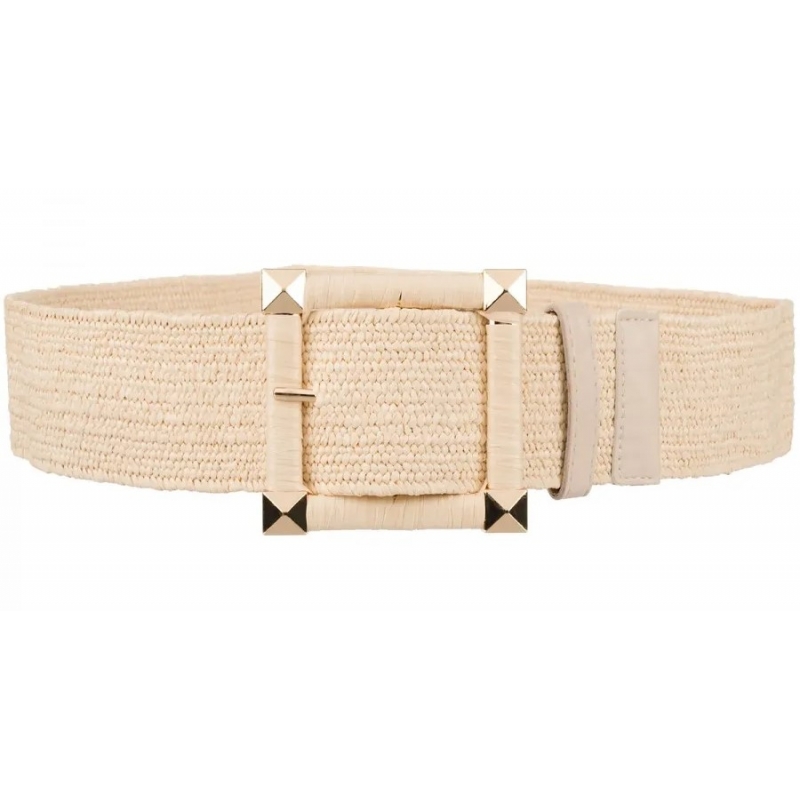 Pasek szeroki na gumie z metalową klamrą w słomkowym stylu.