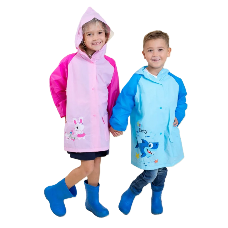 Płaszcz wodoodporny o uniwersalnym kroju dla dzieci chroni przed deszczem i wiatrem.