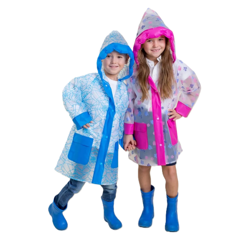 Płaszcz wodoodporny o uniwersalnym kroju dla dzieci chroni przed deszczem i wiatrem.