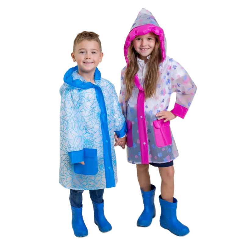 Płaszcz wodoodporny o uniwersalnym kroju dla dzieci chroni przed deszczem i wiatrem.