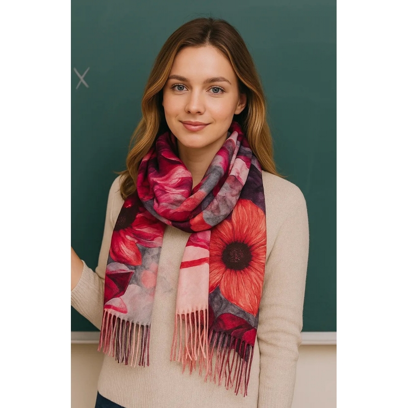 Szalik damski szal jesień zima KWIATY na prezent z frędzlami RC15-8 bordowy.