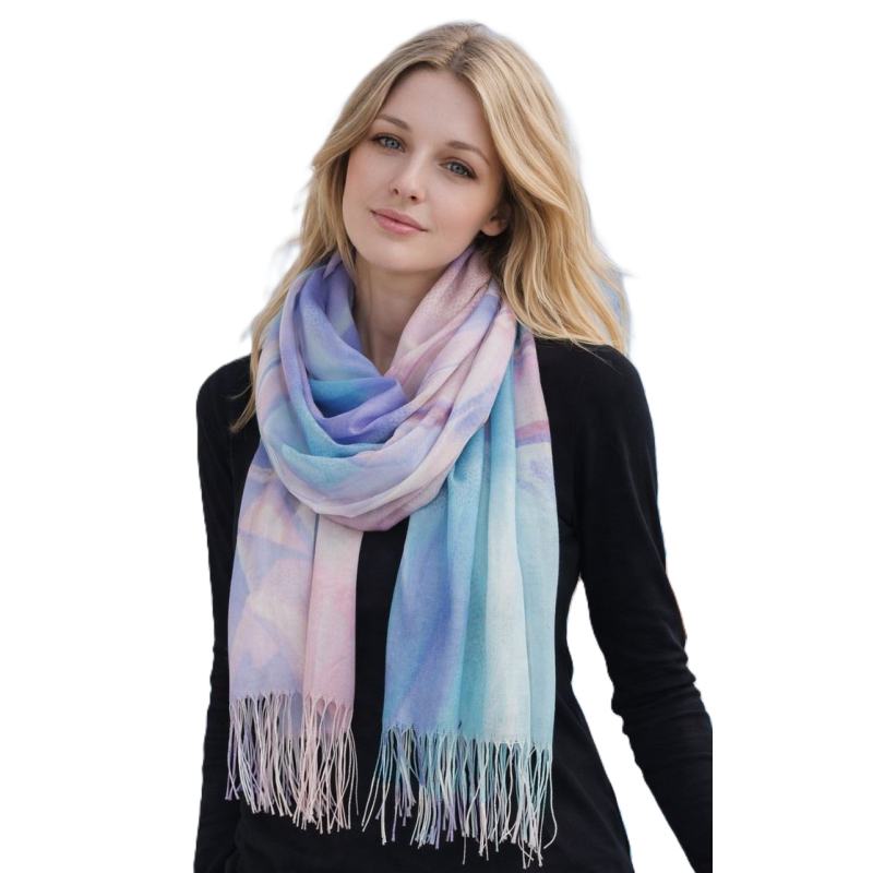 Szalik cienki z pięknym wzorem tęczowym, niezwykle modny, kobiecy dodatek.